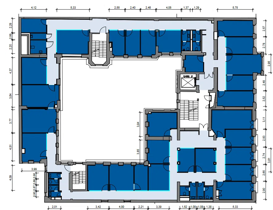 Der denkmalgeschützte Altbau wurde um 1888 erbaut und im Jahr 1994 liebevoll und aufwändig restauriert. Insgesamt kann das fünfgeschossige Büro- und Geschäftshaus in den vier Etagen 1. OG bis 4. OG eine Bürofläche von rd. 3.023,01 m², ermittelt nach der gif-Richtlinie, darstellen. Im 5.OG (Dachgeschoss) befinden sich zusätzlich zwei Wohnungen.